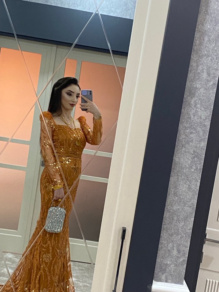 Turuncu renkli, uzun kollu ve tekne yaka bu abiye elbise, parlak etnik desenlere ve transparan detaylara sahiptir. Düğünler için uygun, regular fit model. ✨