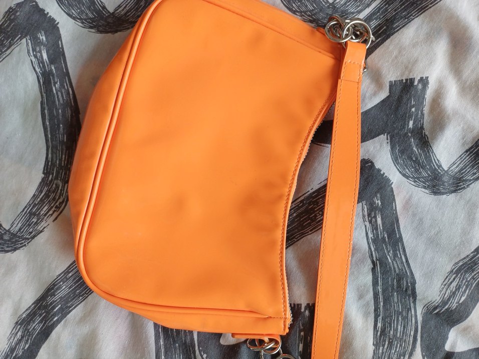 Turuncu parlak renkte, fermuarlı kapama ve sentetik kumaştan yapılmış kadın çantası. Sokak stili ve dış mekanlar için uygundur.
