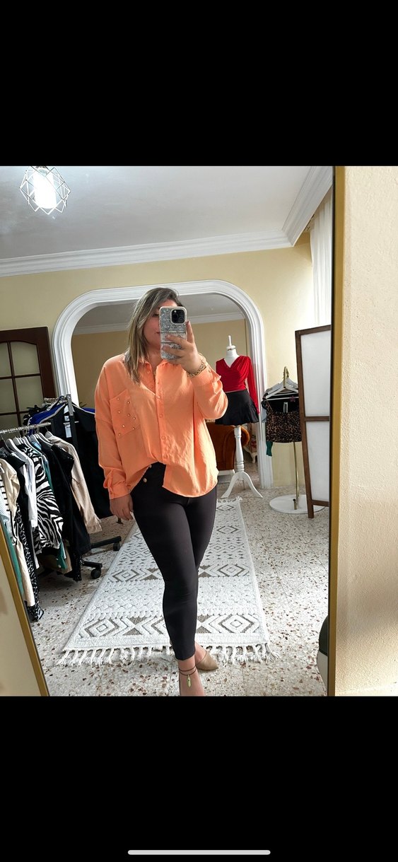 Açık turuncu, salaş kesim ve yüksek yakalı kadın gömleği. Uzun kollu günlük kullanım için rahat ve şık bir tarz sunar.