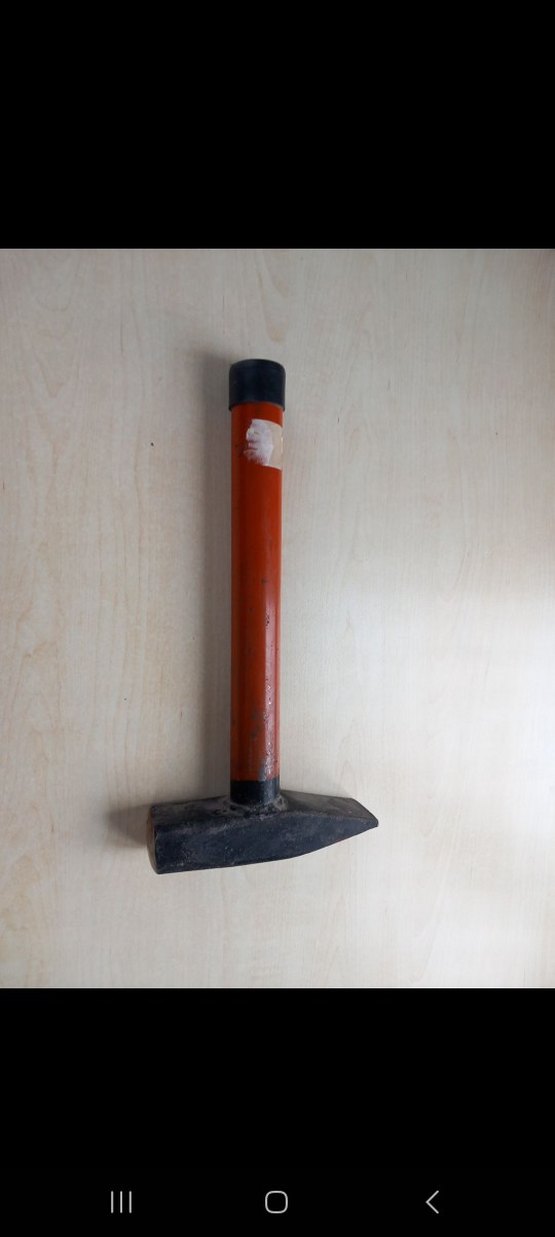 Turuncu saplı, sağlam siyah metal başlıklı çekiç, çeşitli işler için uygundur.