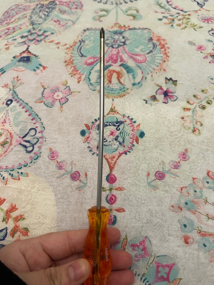 Uzun metal sap ve turuncu saplı, hassas vida sıkma işler için uygun bir tornavida.