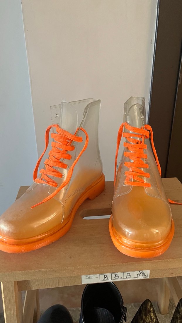 Kadın 39 numara şeffaf yağmur botu.Yumuşak taban.Rahat kalıp.Renkli ve figürlü çoraplarla çok keyifli oluyor.Markasını hatırlayamadım.