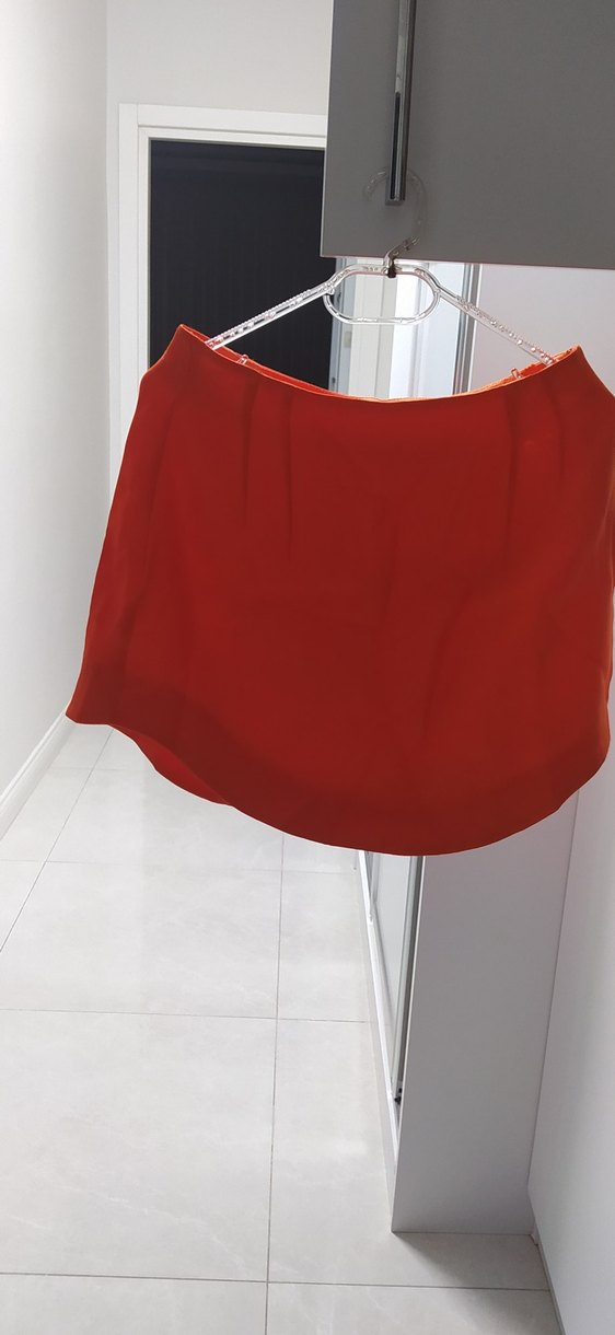 Kırmızı parlak saten kumaştan, drapeli ve bol kesim midi hamile eteği. Çağdaş, minimalist tarzda, açık hava etkinliklerine uygun. ✨