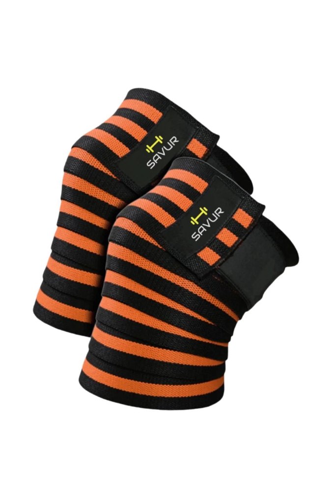 Elastik, turuncu ve siyah çizgili sentetik kumaştan fitness dizliği koruma sağlar. Squat gibi hareketler yaparken sakatlanmayı önler.