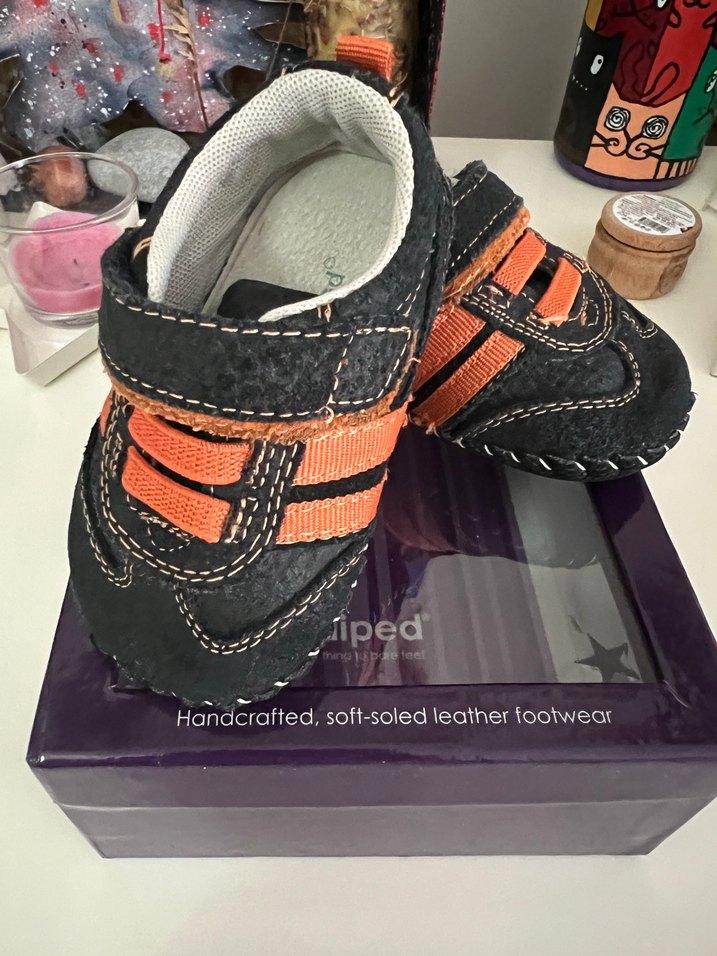 El yapımı, yumuşak tabanlı deri ilk adım ayakkabısı. Koyu turuncu ve siyah renklerde, tokalı ve biker tarzında tasarlanmıştır.