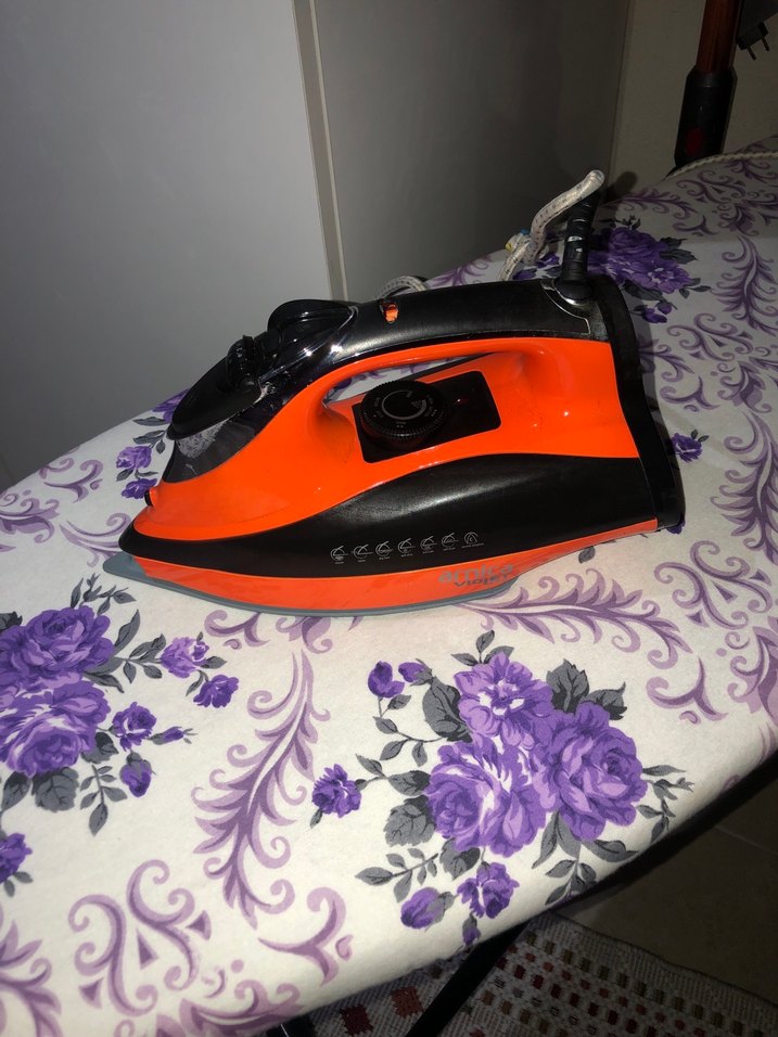 Ayarlanabilir sıcaklık kontrolüne sahip turuncu siyah elektrikli ütü, kolay kayma sağlayan tabanıyla etkili ütüleme sunar. Kırık yeri vardır ama kullanıma engel değil
