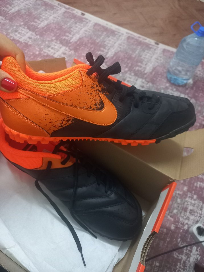 Koyu turuncu ve siyah renklerde, baskılı desenli erkek futbol ayakkabısı. Kauçuk malzeme ve velcro kapanışlı, spor ve sokak stili için uygundur. ⚽