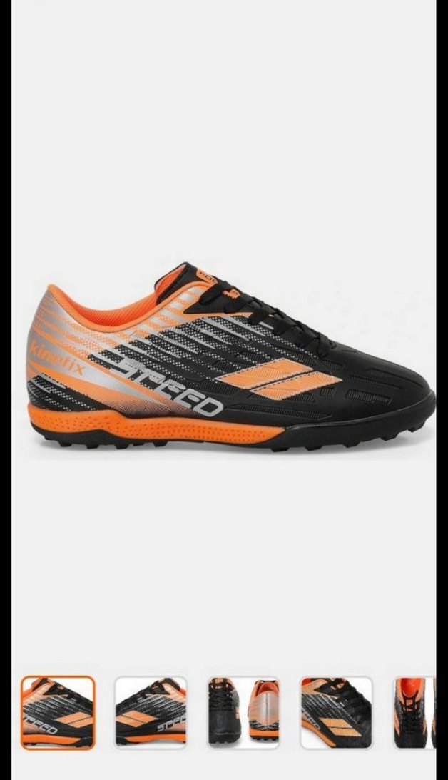Turuncu ve siyah baskılı tasarıma sahip, kauçuk tabanlı ve Velcro bantlı erkek futbol ayakkabısı. Sportif ve trend görünümlü. ⚽