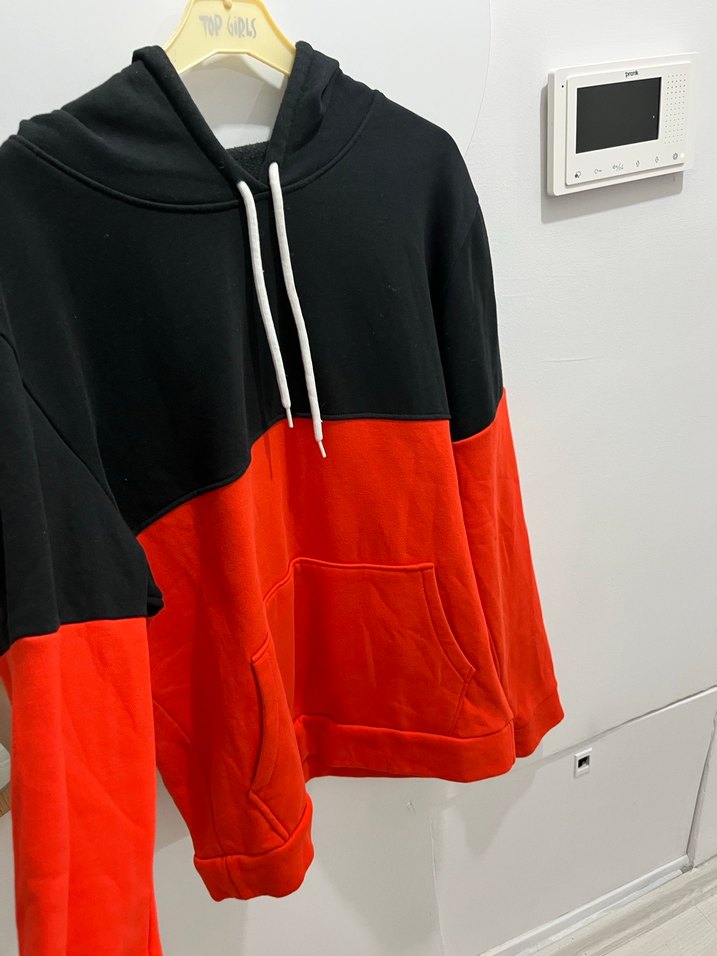 Oversize kesim, yuvarlak yaka ve uzun kollu sweatshirt. Yumuşak ve sıcak kumaştan üretilmiş, fermuarlı detaylı, turuncu ve siyah renk bloklu günlük kullanıma uygun.