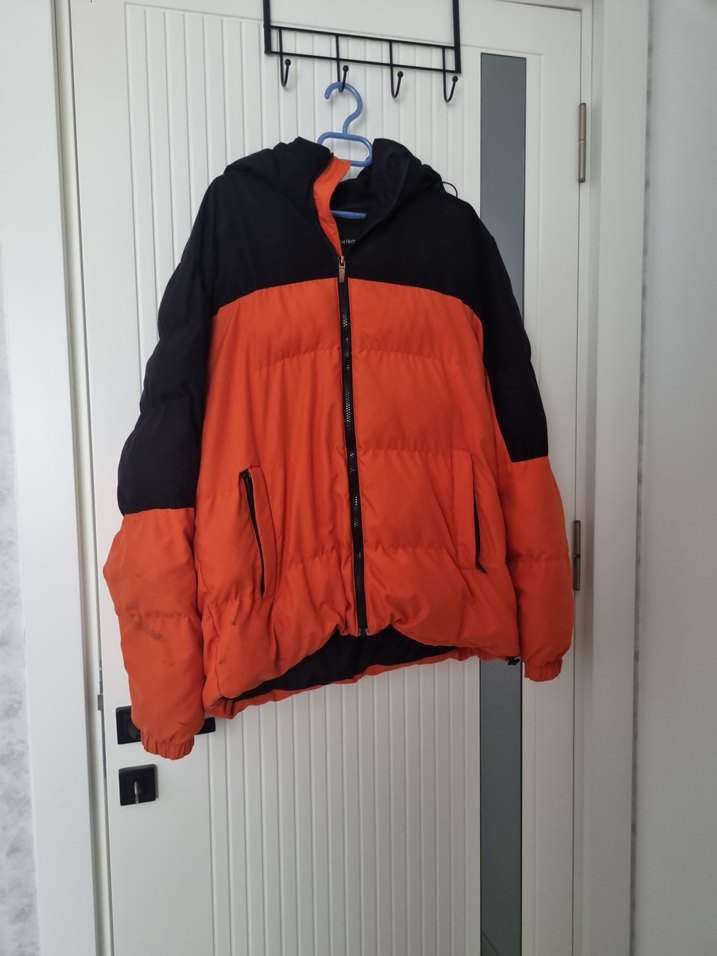 Erkek mont, bol kesim, uzun kollu ve yüksek yakalıdır. Fermuarlı önde, yumuşak ve sıcak kumaştan yapılmıştır. Siyah ve turuncu renklerin kombinasyonuyla outdoor stiline uygundur. kolunda ve etek kisminda leke var uygun fiyata veriyorum