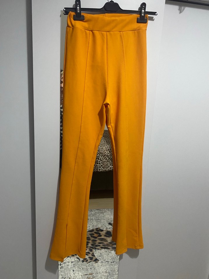 Turuncu renkte, slim fit kesim ve maxi boy kadın kumaş pantolon. Sentetik kumaştan üretilmiş, yırtmaç detaylı. Streetwear ve athleisure tarzına uygun. Etiketi söküldü ama hiç giyilmedi
