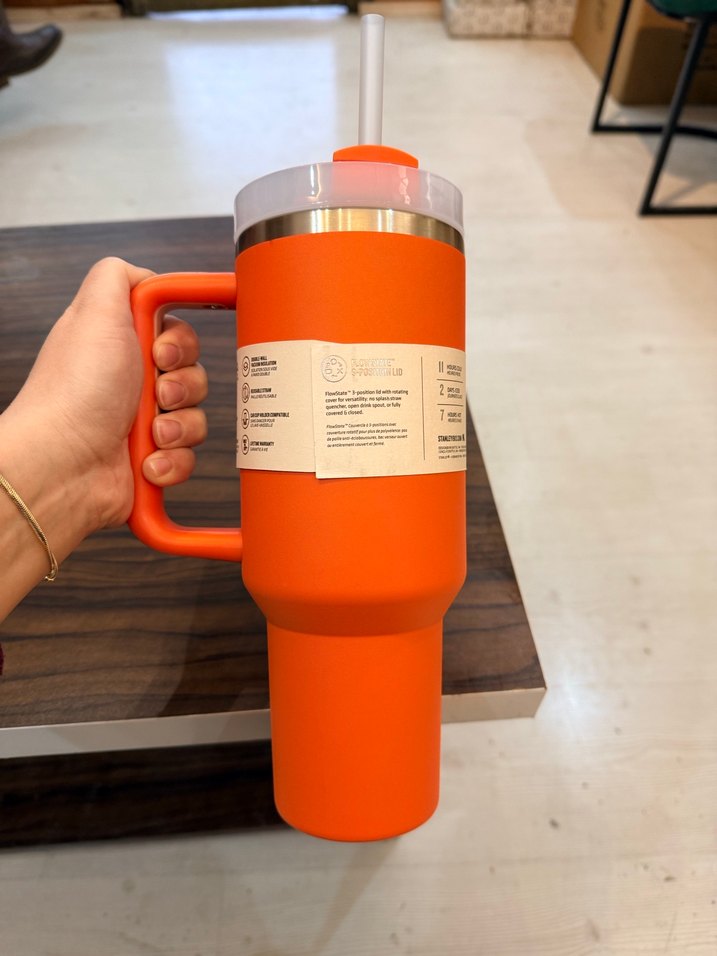 Turuncu renkte, saplı, şeffaf kapaklı ve pipetli Stanley termos. Paslanmaz çelik detaylı, kolay tutulur tasarım. 1.18Litre kutuyla gönderim yapılmaktadır