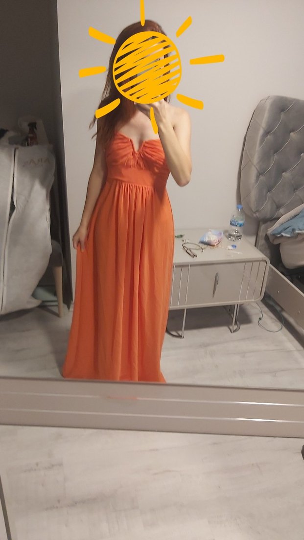 Turuncu renkli, straplez ve uzun kesim elbise, drapeli tasarıma sahiptir. İnce kumaştan yapılmış, bohem ve minimalist tarzı yansıtır. Kolsuz ve desensiz, cesur ve şık bir görünüme sahiptir.