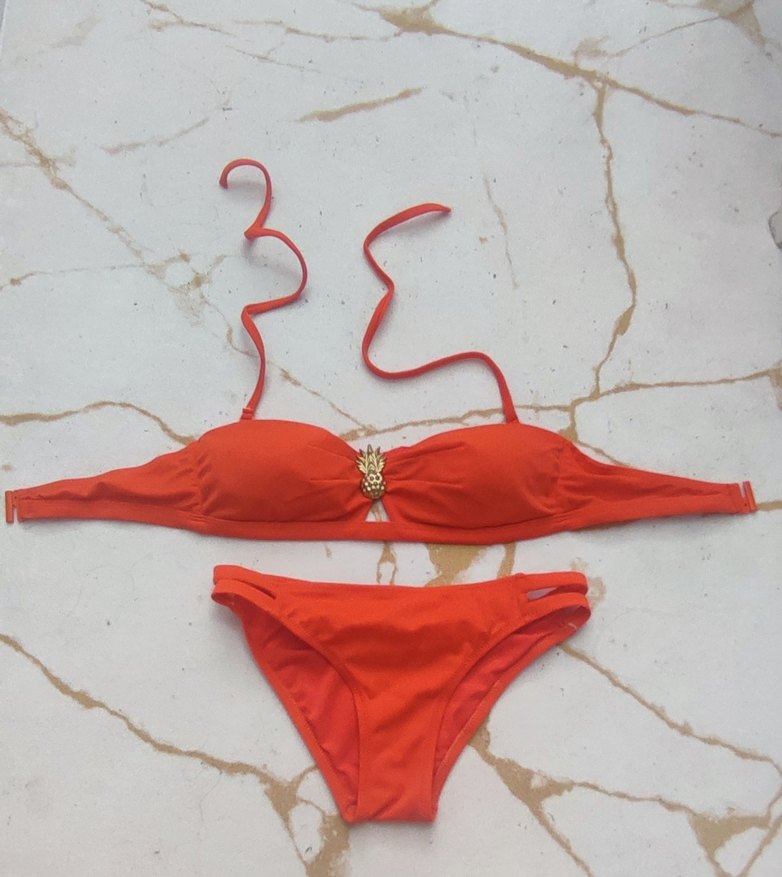 turuncu renkli, strappy askılı ve vücuda oturan bikini takımıdır. Minimalist ve bohem tarzıyla plajda şıklık sunar.