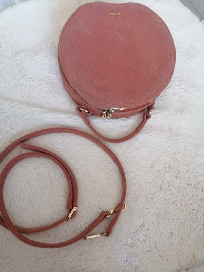 Turuncu süet malzemeden yuvarlak kadın omuz çantası,tokalı askısıyla bohem tarzını yansıtıyor. Pastel tonlarıyla günlük kullanıma uygun. Sadece rengi soldu onun dışında sorunu yok