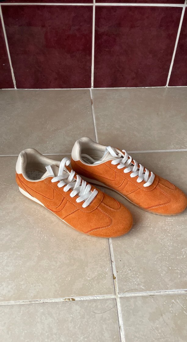 Turuncu süet kadın spor ayakkabılar, beyaz bağcıklarla. İnce topuklu, desen içermeyen ve renkli bu spor ayakkabılar günlük kullanım için şık ve rahat bir seçenektir. İNCİ MARKA LANSMAN ÜRÜNÜDÜR