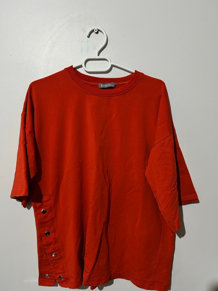 Tok bir kumaşı var. Yandan çıt çıt düğmeli turuncu renkli oversize