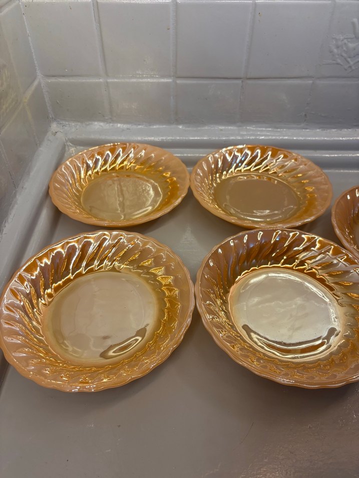 Parlak bej renkte, düz ve klasik tarzda, kenar detaylı tabak seti.az kullanılmış 5 parça yemek tabağı