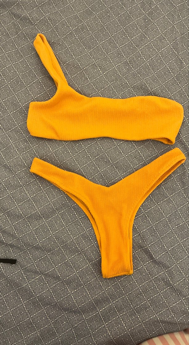 Sarı, askılı ve vücuda oturan bikini, cesur ve zahmetsiz şıklık sunar. dokulu kumaştan üretilmiştir. 1 kere giyilmiştir