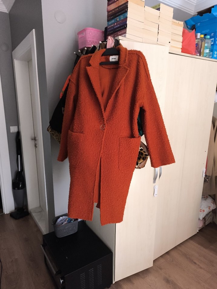 Turuncu tek düğmeli kaban, yumuşak dokulu kumaş ve iki ön ceple birlikte klasik yaka sunar. Serin havalar için uygundur.