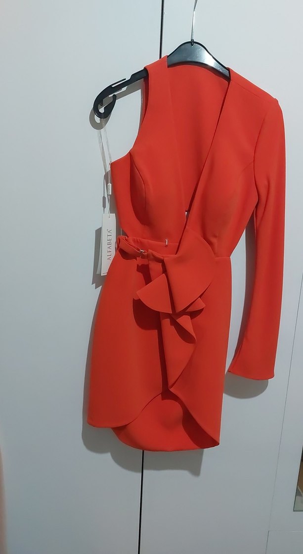 Kırmızı, tek kollu, V yaka, kısa ve vücuda oturan modern tasarımlı mini elbise.