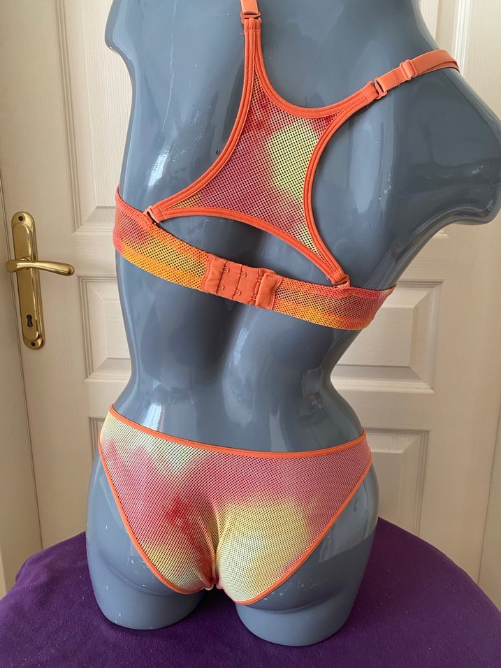 80B beden. Turuncu tie-dye desenli sütyen ve külot takımı, sırt kısmında file detaylı racerback tasarıma sahip, spor ve sokak stili birleşimiyle dikkat çekiyor. Amerika’dan aldığım Triumph marka çok çok az giydim 1.02 kez ancak tertemiz pırıl pırıl !