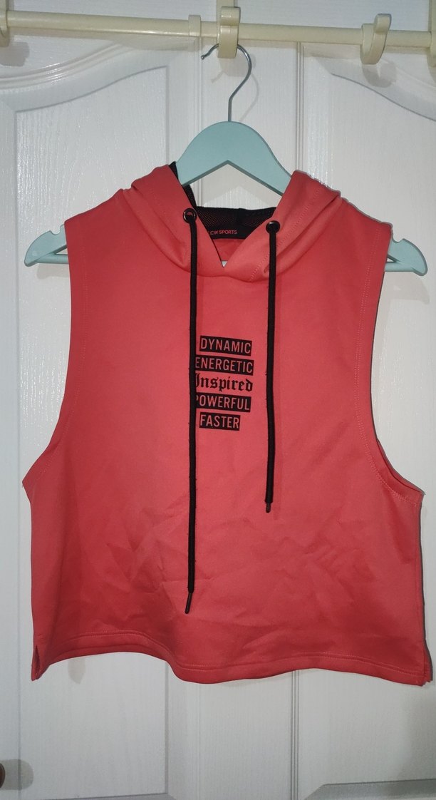turuncu tonlarında, kolsuz ve kapüşonlu spor üst. Renkli baskılı motivasyonel yazılar içerir. Sentetik kumaştan.