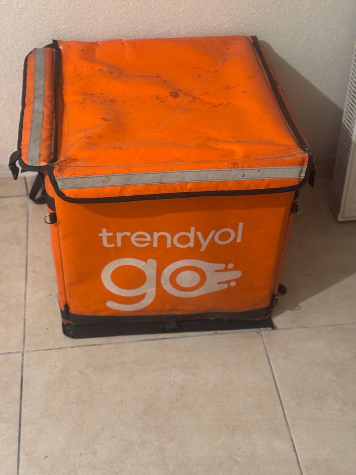 Turuncu renkli Trendyol Go teslimat çantası, gri reflektör şeritlerle donatılmış kare şekildedir.