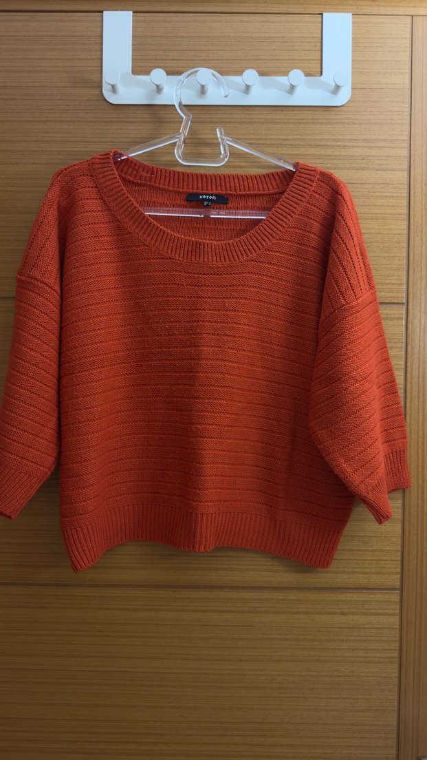 Turuncu renkli, örgü triko kumaştan, yuvarlak yaka ve midi boy kollu. Rahat kesimi ve normal boyu ile günlük kullanıma uygun, renkli ve konforlu bir kazak.