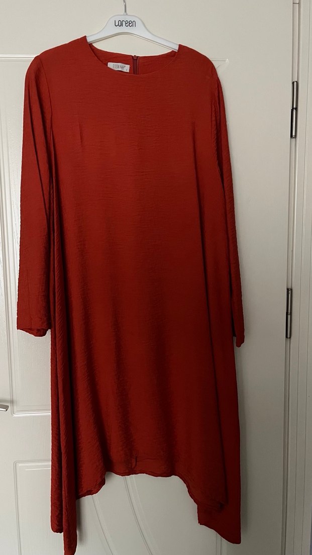 Uzun boy, dökümlü, turuncu kadın tunik. Uzun kollu ve yuvarlak yaka, sade ve romantik tarzlar için uygundur. ❤️