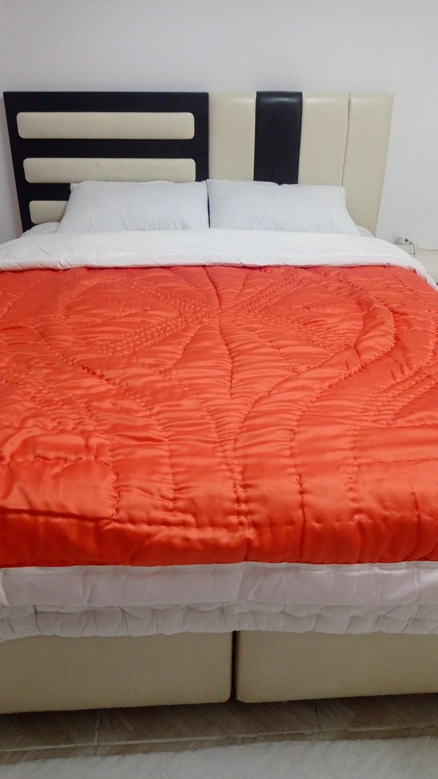 Canlı turuncu renkte, düz desenli yatak örtüsü, yatak odasına renk katan bir parça. ️