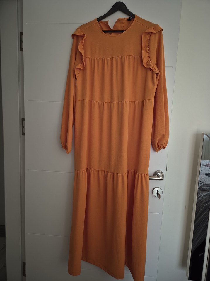Bej rengi, uzun ve bol kesim elbise, omuzlarda fırfır detaylıdır. Uzun kollu ve yuvarlak yakalıdır, parlak kumaştan günlük kullanıma uygundur.