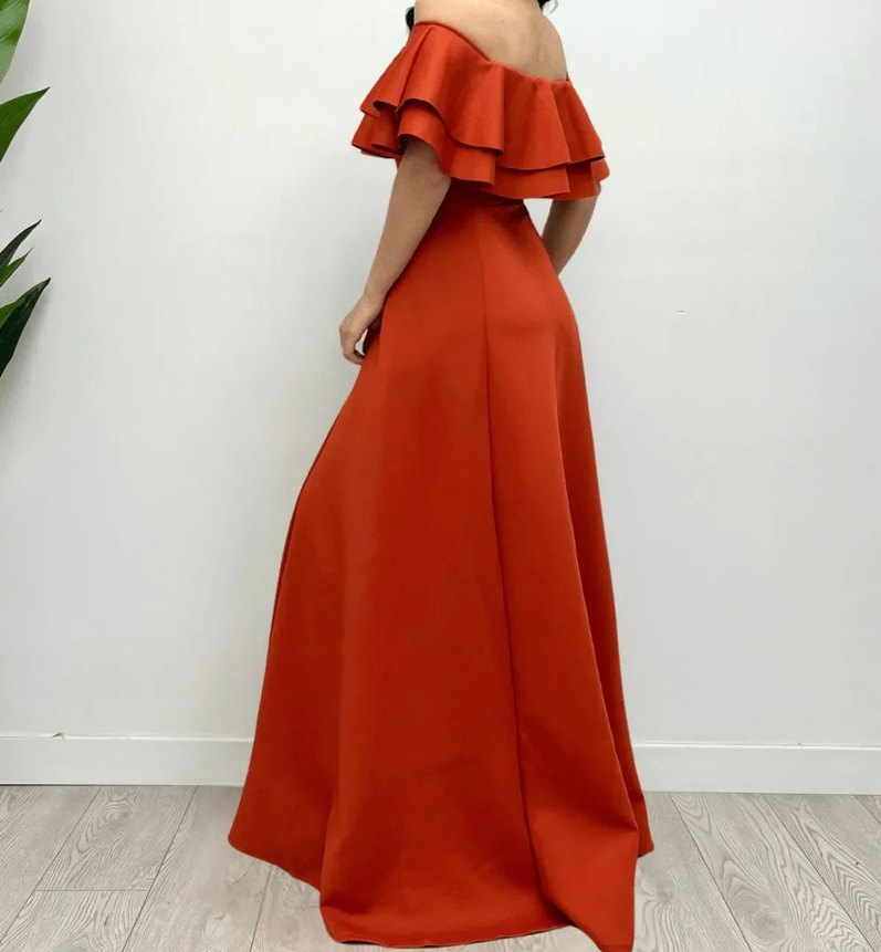 Turuncu Uzun Fırfırlı Kayık Yaka Abiye Elbise