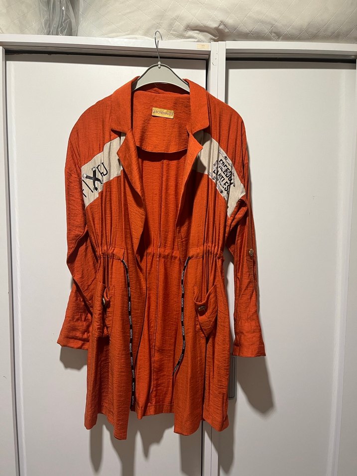 Uzun, bol kesim kadın ceketi, keten kumaştan, yakalı ve düğmeli. Uzun kollu ve cepli, kollarında dekoratif yamalar bulunur. Parlak turuncu rengi bohem ve retro tarzına uygundur.