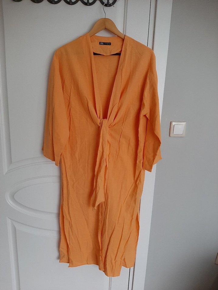 Turuncu, fakir kollu, bol kesim uzun kadın kimono. Minimalist ve bohem tarzda, ön bağcık detayı bulunur. s m l beden uyumlu bir iki kez kullanildi ve yikandi