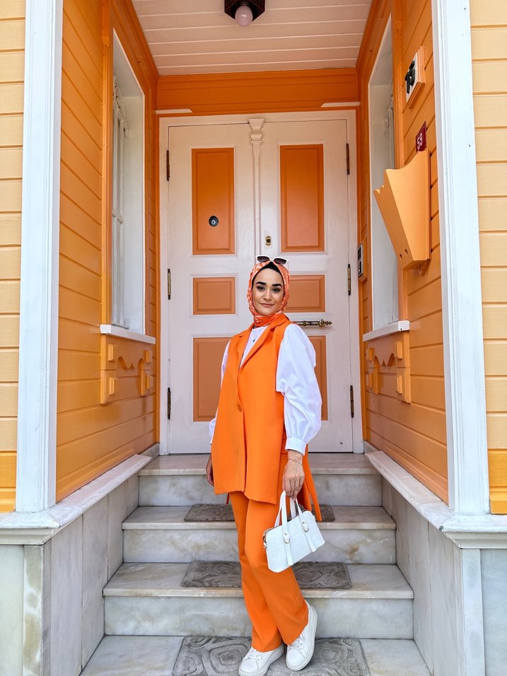 Turuncu renkte, kolsuz uzun kesim ve yakalı kadın takımı. Sentetik kumaştan, minimalist ve rahat stil sunar.