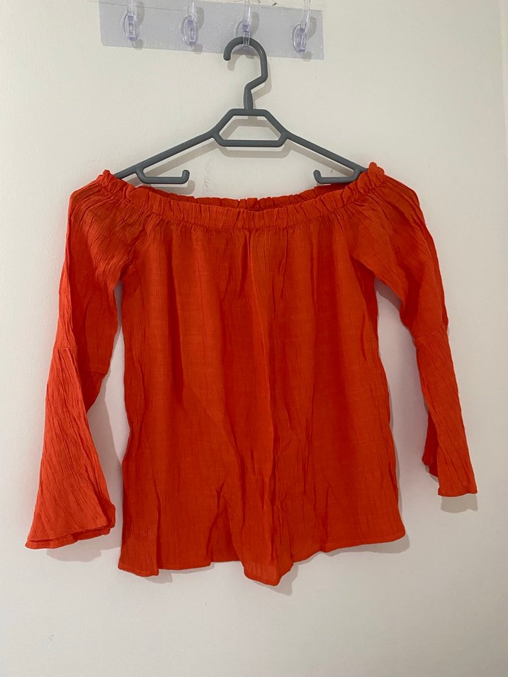 uzun kollu ve kayık yaka turuncu bluz. Düğmeli ve parlak dokusuyla günlük kullanıma uygundur.