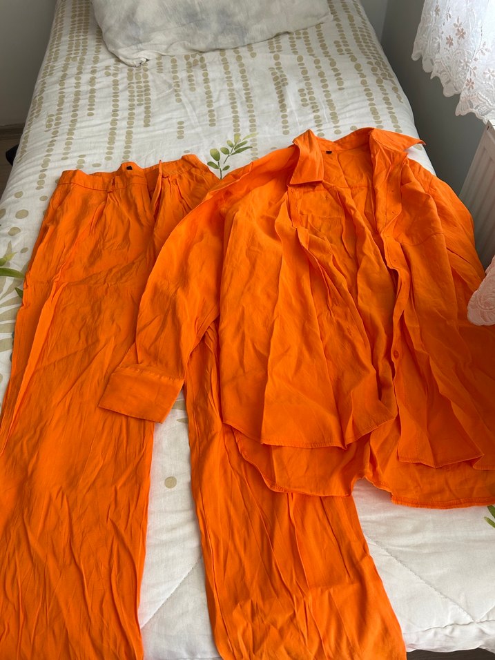 Parlak turuncu renkte, uzun kollu ve drapeli kumaştan oluşan, bol kesim erkek pijama takımı. Minimalist ve rahat bir sokak stili sunar.