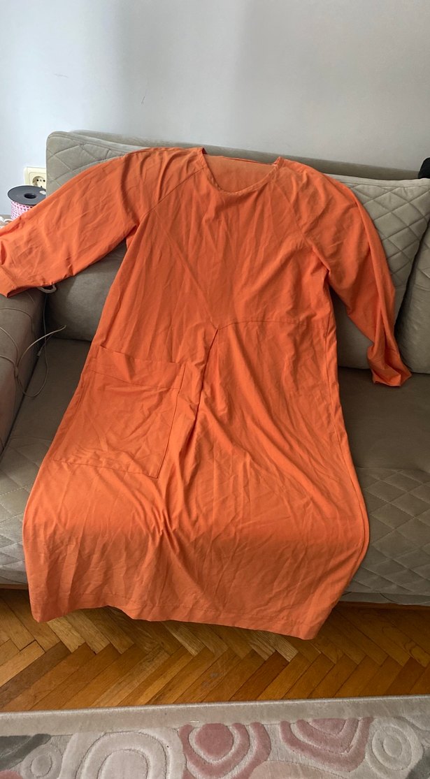 Turuncu parlak renkte, keten kumaştan, bol kesim ve uzun boy hamile tunik. Uzun kollu, yuvarlak yaka ve drapeli tasarıma sahip, günlük kullanıma uygun.
