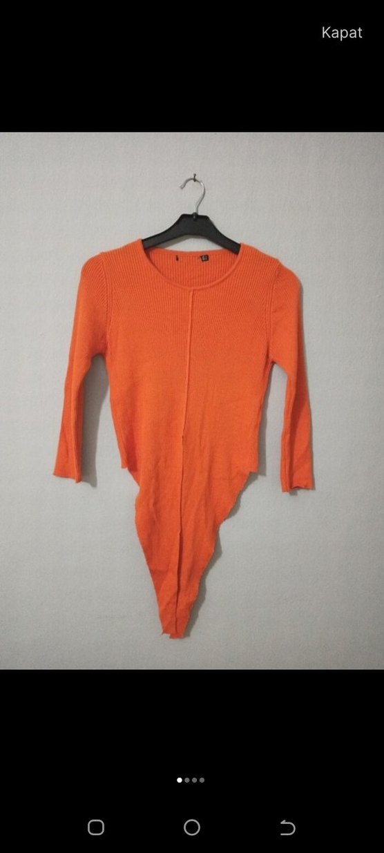 Turuncu uzun kollu, yuvarlak yaka, dar kesim kadın bluz. Yumuşak sentetik kumaştan, midi boy ve minimalist tarzda, sokak modasına uygun.