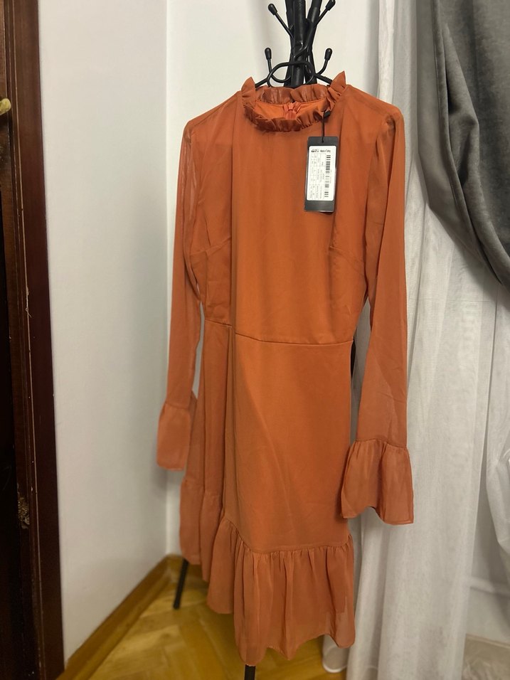 Kahverengi süet kumaştan, uzun kollu, yüksek yakalı ve fırfırlı detaylara sahip salaş kesim kadın elbisesi. Trend sokak stili için uygundur. Tam rengi ilk resimdeki