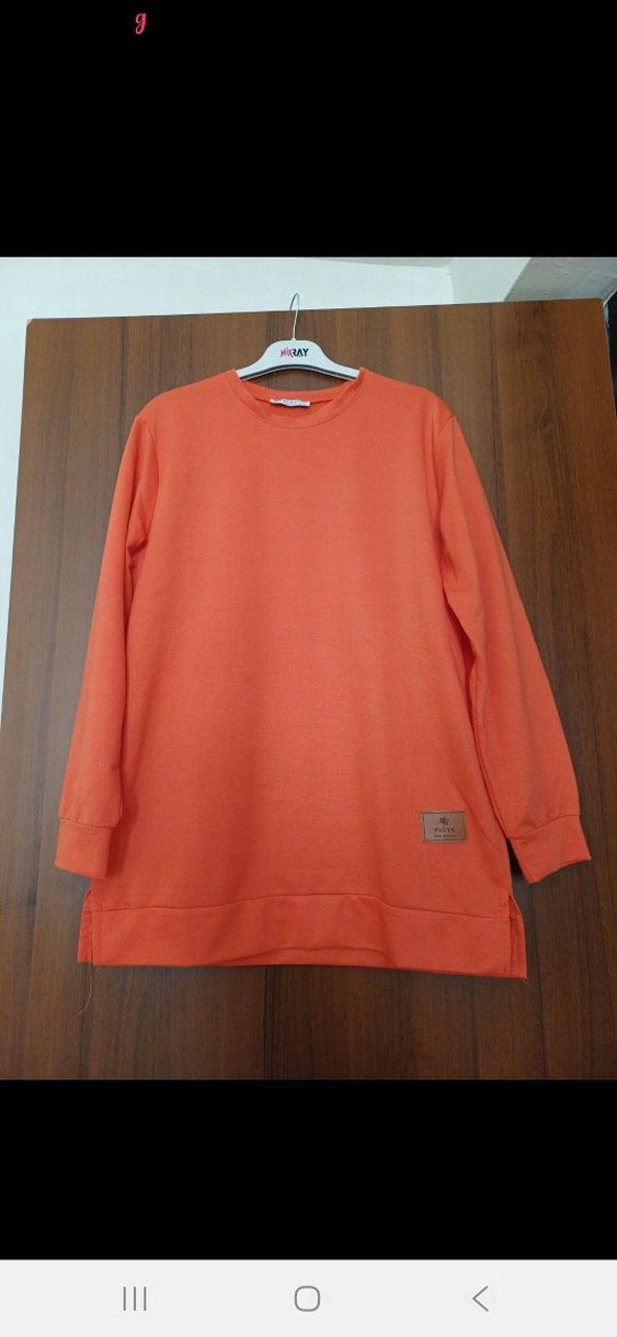 Turuncu renkte, uzun kollu, yuvarlak yaka ve bol kesim midi uzunluğunda kadın tunik. Yumuşak ve sıcak kumaştan üretilmiştir, günlük sokak stiline uygundur.