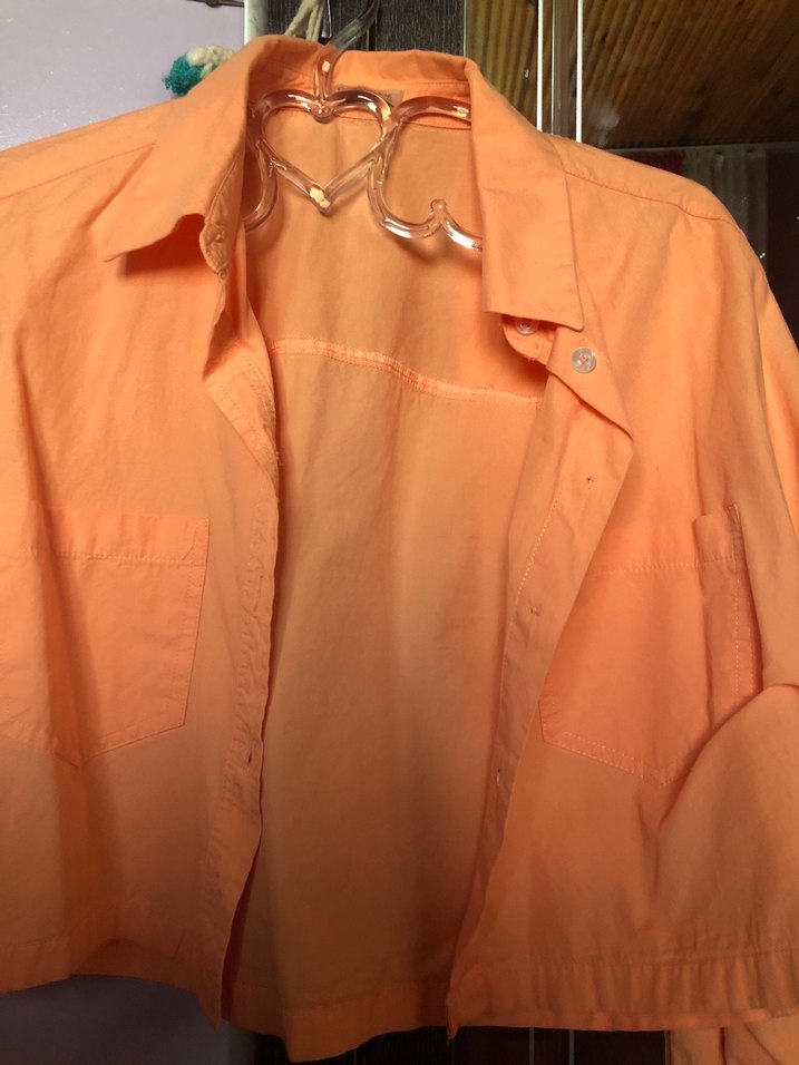 Parlak turuncu renkli, yakalı ve düğmeli ön kısmı olan, uzun kollu, bol kesim midi boy gömlek. İpek gibi dokusuyla günlük kullanıma uygundur.