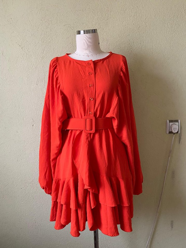turuncu Uzun Kollu Midi Elbise