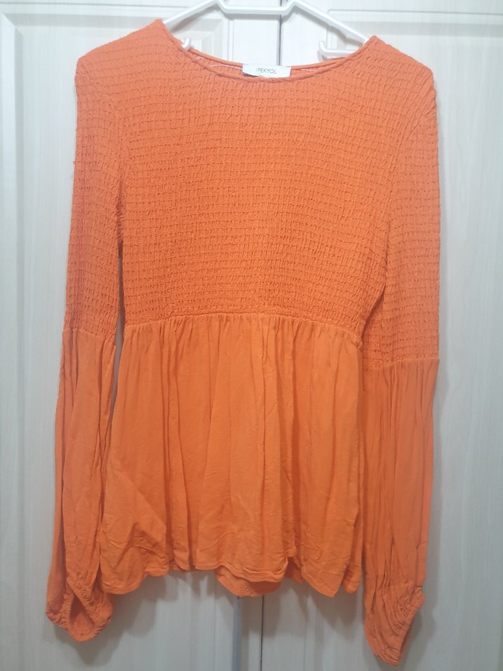 İpekyol marka, turuncu renkli, uzun kollu ve yuvarlak yakalı kadın bluz. Vizkoz kumaştan, piliseli detaylara sahip,üst kısmı dar ve büzgülü,alt kısmı düz, bohem tarzına uygun bir parça.