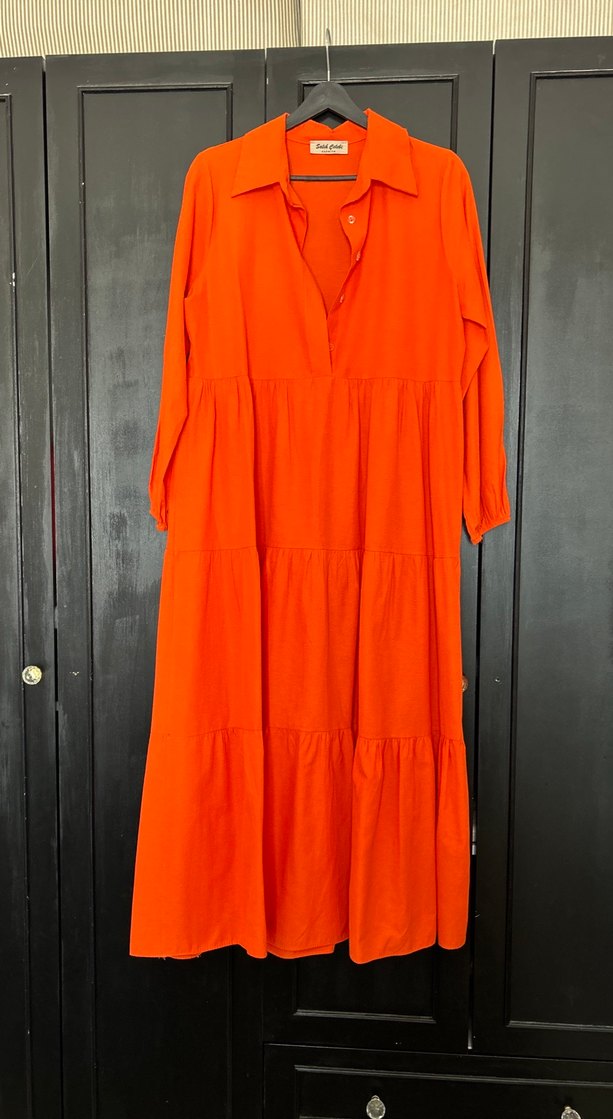 Turuncu renkte, poplin kumaş bol kesim elbise. Yaka ve uzun kollu, drapeli tasarımıyla bohem tarzını yansıtıyor.