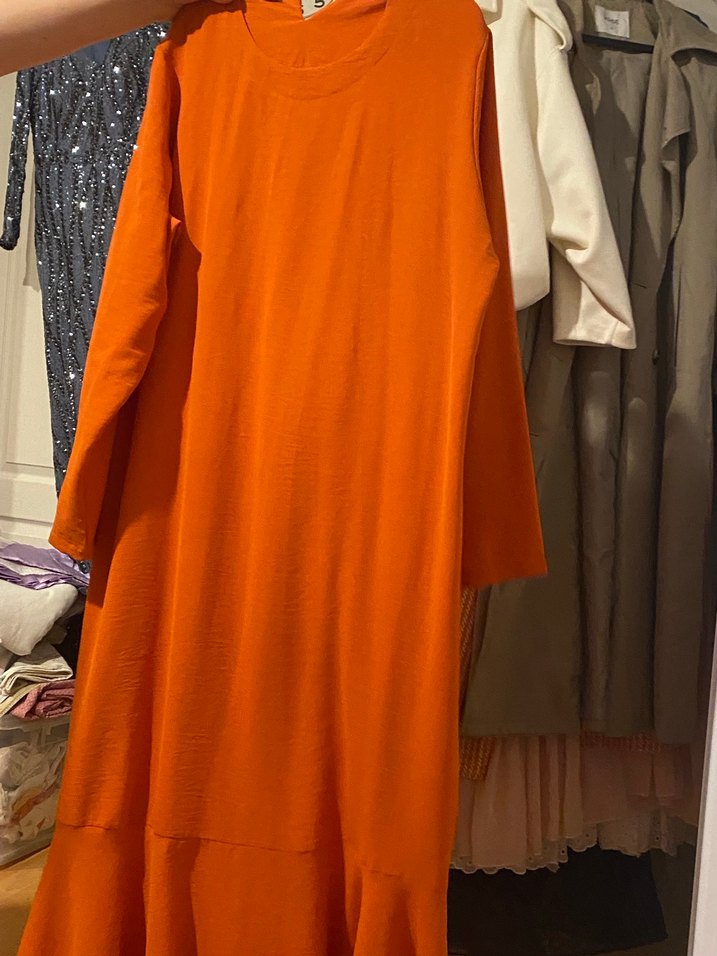 Turuncu renkte, uzun kollu ve salaş kesim kadın elbisesi. Sentetik kumaştan, drapeli ve günlük kullanıma uygun rahat bir model.