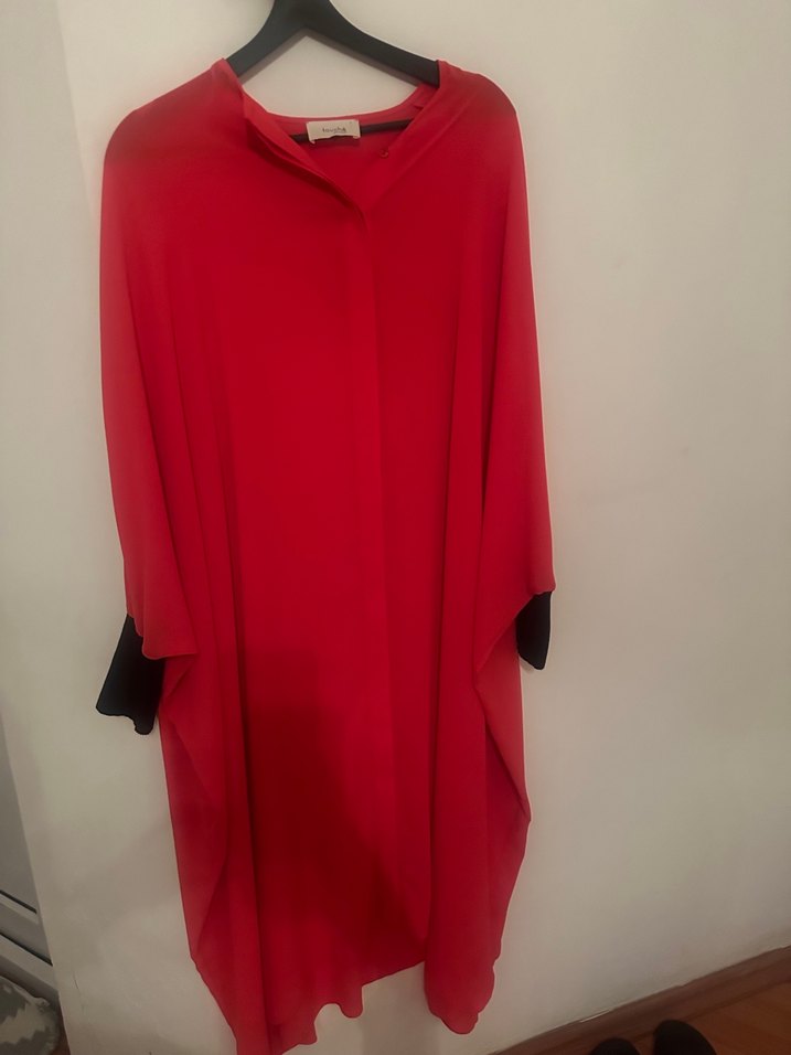 Turuncu renkte, yüksek yakalı, uzun kollu ve dökümlü şifon kumaştan salaş uzun tunik. ✨