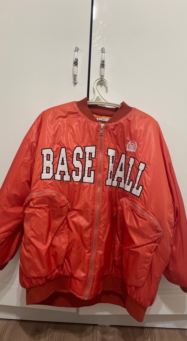 Uzun kollu, kruvaze yaka, turuncu kadın ceket. Fermuarlı ve "BASEIALL" baskılıdır. Parlak plastik malzemeden yapılmıştır, spor tarzı için uygundur . Boy:72 cm En omuz:52 cm