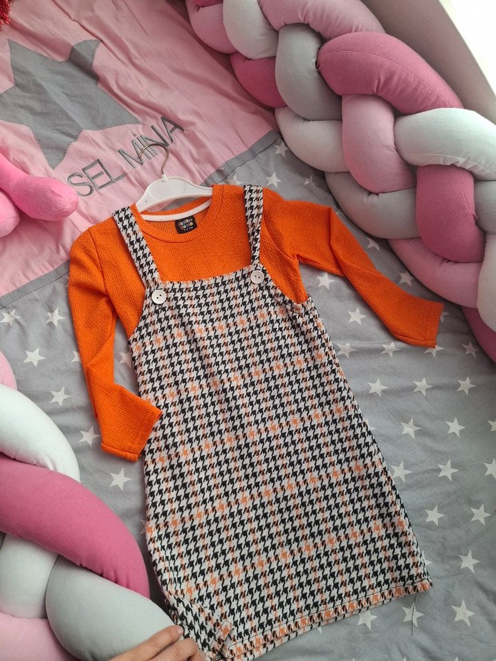 Turuncu renkli, uzun kollu ve bisiklet yaka kız elbisesi. Rahat kesim, yumuşak sentetik kumaştan örme dokulu, trend sokak stili için uygun. ikisi ayrı ayrı ikili takım
